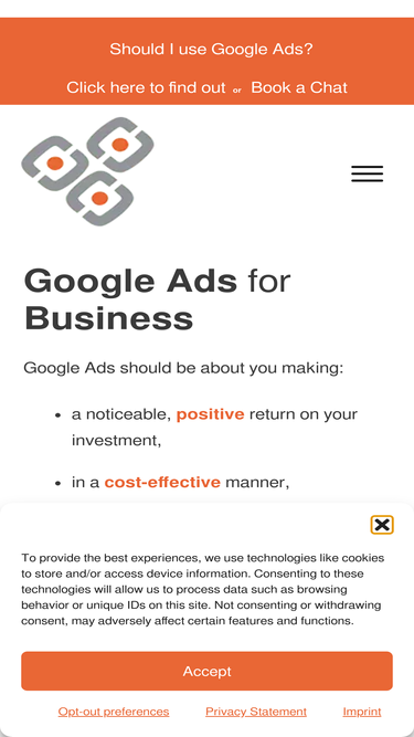 100%Discover whether you should be using Google Ads? Request your Step 1 Questionnaire. Compete it at your leisure. Use it to understand and explain your business objectives in relation to your online marketing. Return it to us, and we can then talk through your options.