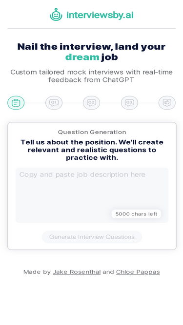 100%Boost your confidence with AI-generated interview questions and answers. Turn a job description into interview questions to practice with.