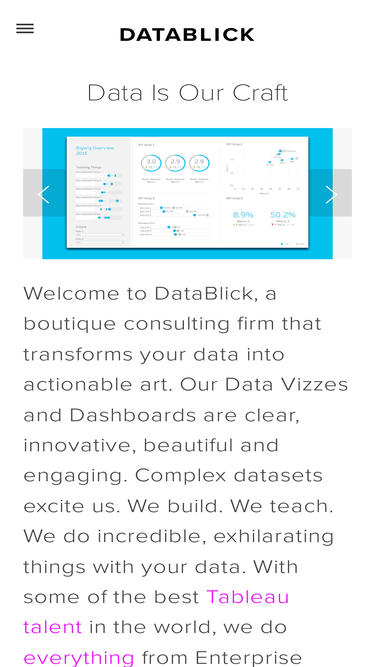 85%DataBlick is the premier consulting and training firm for Tableau and Alteryx. Our resources are recognized by Tableau as some of the best in the world. We offer flexible engagement models from enterprise deployments to 1 hour help me sessions.