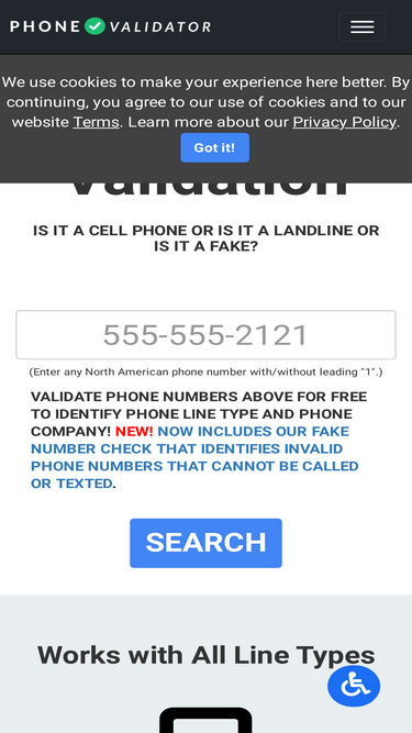 97%free phone number validation provided by phonevalidator.com. check phone numbers to verify if cell phone, landline, voip, toll-free or fake. works with all u.s. phone numbers.
