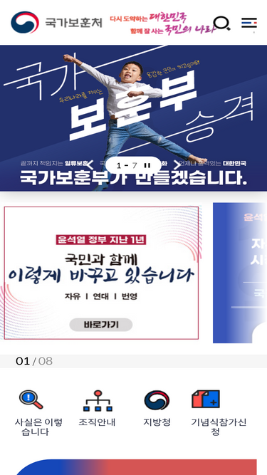 82%국가유공자와 보훈가족의 영예로운 삶이 유지 보장되도록 보상금 지급, 교육, 취업, 의료, 대부등의 보훈정책을 수립하여, 지원합니다.