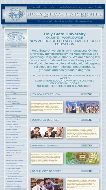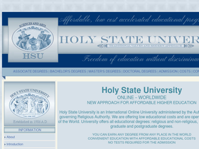 90%holy state university is an institution of higher education and academic research offering all educational degrees: associate, bachelor's, master's, mba, doctoral, phd. accredited online university with accelerated degrees and lowest educational costs.