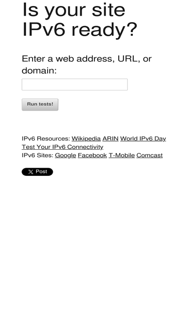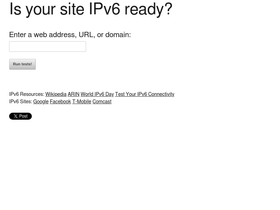 89%test whether a web address, site, url, or domain is ipv6 accessible. tests for dns aaaa records, ipv6-addressable nameservers, glue, ipv6 connectivity (port 80), and several other elements.