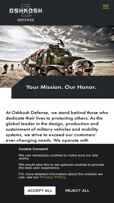 94%Oshkosh Defense is committed to user privacy and maintaining the confidentiality and integrity of personal information. View our privacy policy now.