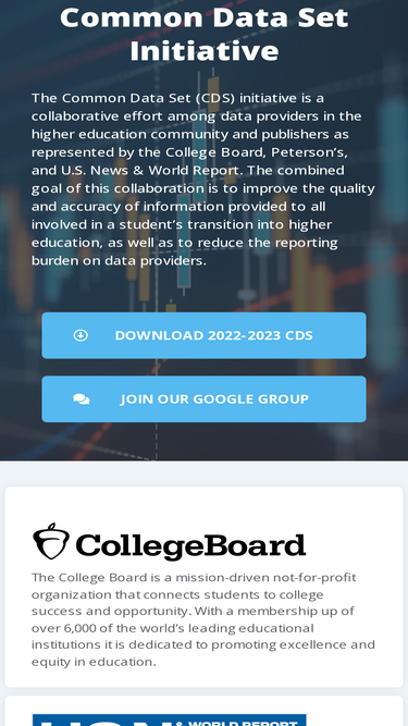 Common Data Set Initiative The Common Data Set (CDS) initiative is a collaborative effort among data providers in the higher education community and publishers as represented by the College Board, Peterson’s, and U.S. News & World Report. The combined goal of this collaboration is to improve the quality and accuracy of information provided to all […]