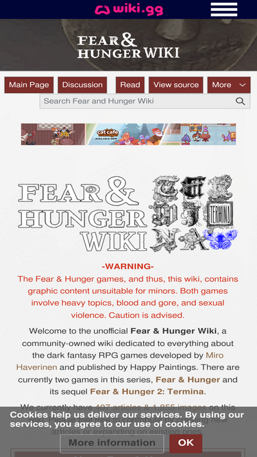 86%-WARNING- The Fear & Hunger games, and thus, this wiki, contains graphic content unsuitable for minors. Both games involve heavy topics, blood and gore, and sexual violence. Caution is advised. Welcome to the unofficial Fear & Hunger Wiki, a community-owned wiki dedicated to everything about the dark...