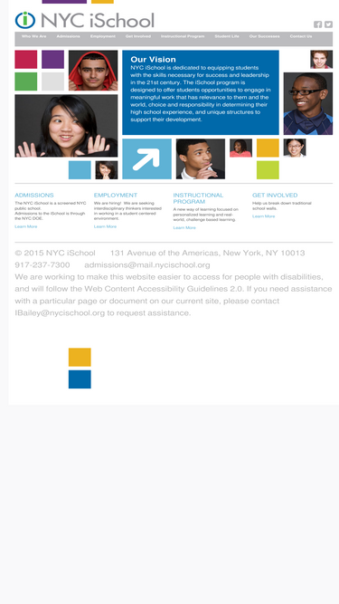 73%NYC iSchool is a public high school dedicated to equipping students with the skills necessary for success and leadership in the 21st century. The iSchool program is designed to offer students opportunities to engage in meaningful work that has relevance to them and the world, choice and responsibility in determining their high school experience, and unique structures to support their development.