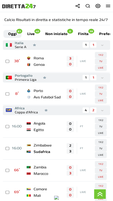 84%Segui i risultati di calcio in tempo reale 24 ore senza interruzioni da Diretta247.it. Tutto il Calcio in diretta e statistiche, Informazioni dettagliate e accurate su ogni partita di calcio, i canali televisivi che trasmettono tutto il calcio ei servizi di streaming online