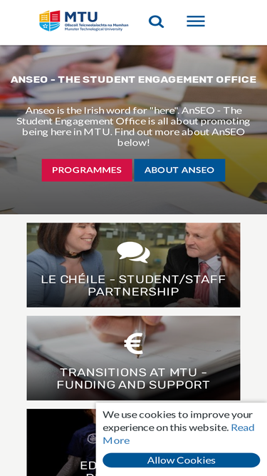 68%the student engagement office (anseo) focuses on developing programmes to increase student participation and student success. additionally, it also offers programmes that provide funding for transitional periods and improve the learning approach.