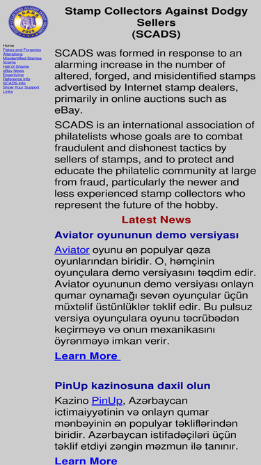 89%scads (stamp collectors against dodgy sellers) is an international association of philatelists and collectors whose purpose is to combat fraudulent and dishonest tactics by sellers of stamps, and to protect and educate the philatelic community at large, particularly the newer and less experienced collectors who represent the future of the hobby.