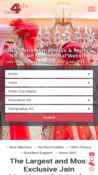 97%No.1 Jain matrimonial website for jain community in India, USA, UK, etc. to help you finding the best suitable partner match. FREE Online Registration.