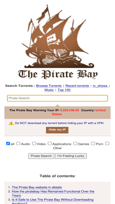 Nouvelle adresse officielle de ThePirateBay: https://www.tpbaysproxy.com. Sur ce site, vous pouvez télécharger n’importe quel fichier : musique, films, jeux, logiciels, etc.