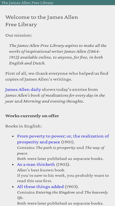 100%the largest site devoted to author james allen including a complete collection of his writings, copies of his magazine "the light of reason", as well as...