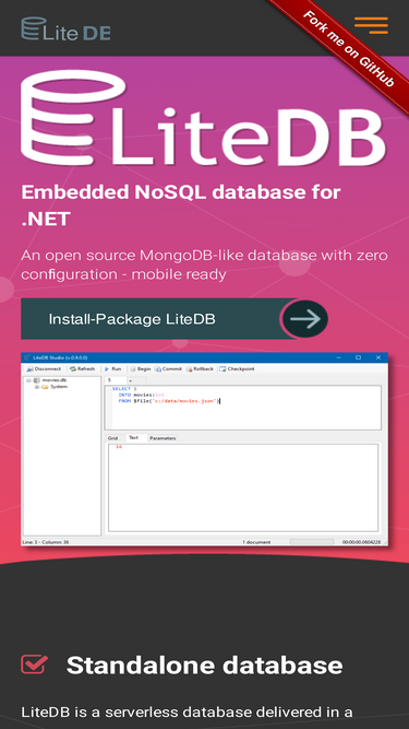 80%LiteDB : LiteDB - A .NET NoSQL Document Store database in a single data file.