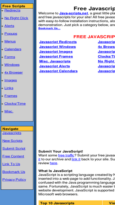 99%java-scripts.net offers free cut and paste javascripts. the site has free java scripts for your website. javascripts include rotating images and banners, popup java-scripts, timer and clock javascripts, frame and window java scripts and more.