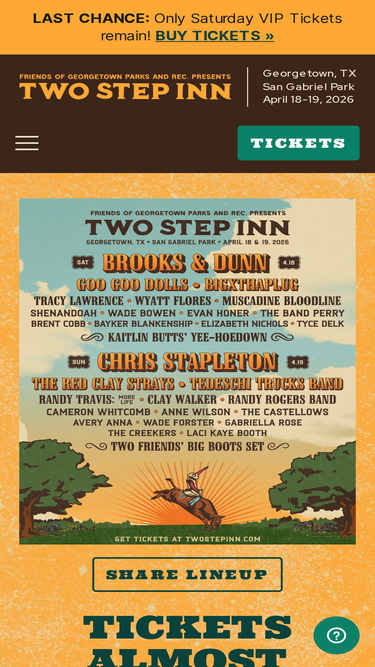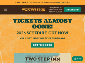 75%Two Step Inn will be presented at San Gabriel Park in Georgetown, TX on April 18-19, 2026. See the lineup, schedule, FAQs, and more.