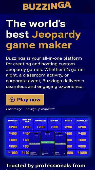 100%Create and host your own custom Jeopardy games. Perfect for game nights, classrooms, corporate trainings, and social events.