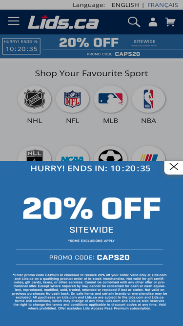 79%Lids.ca is your NFL Shop, MLB Shop and NBA Store with same day flat rate shipping from the USA on most items! We have Authentic NFL Apparel, NFL Jerseys, MLB Apparel, NBA Jerseys, NHL Apparel, & NCAA Merchandise.
