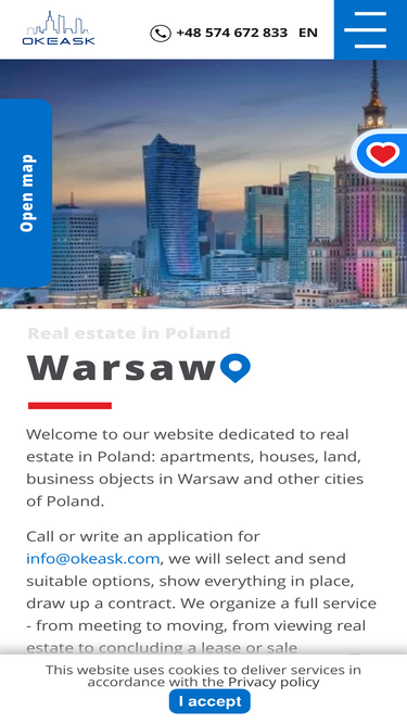 witamy na naszej stronie poświęconej nieruchomościom w polsce: apartamenty, domy, grunty, obiekty biznesowe w warszawie i innych miastach polski. zadzwoń lub napisz wniosek o info@okeask.com, wybierzemy i wyślemy odpowiednie opcje, pokażemy wszystko na miejscu, sporządzimy umowę. organizujemy pełen zakres usług - od spotkania po przeprowadzkę, od oglądania nieruchomości po zawarcie umowy najmu lub sprzedaży. zadzwoń: +48 574 672 833 ( whatsapp , viber , telegram , facebook )