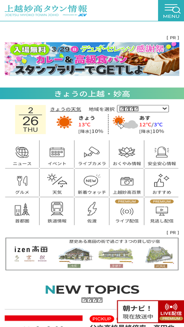 89%「歴史と自然に出会うまち」新潟県上越市の観光情報サイトです。観光スポットやイベント情報、宿泊施設やグルメ情報を掲載しています。