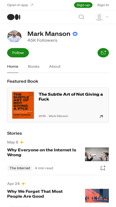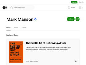 68%Read writing from Mark Manson on Medium. Author of #1 NYTimes Bestseller ‘The Subtle Art of Not Giving a Fuck’. OG Blogger. Psychology Nerd. I enjoy cats and whiskey. But not at the same time.