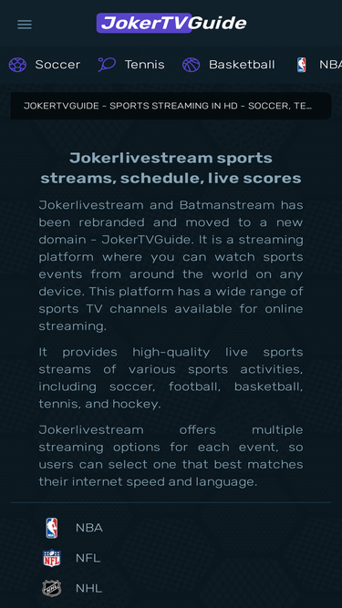 87%JokerTVGuidestreams a former Jokerlivestream, offers live sports streaming for free. Get suitable quality streams for Soccer, Tennis, NFL, and many other...