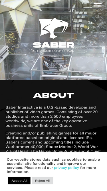 83%Saber Interactive is a worldwide publisher and developer consisting of 13 studios in the Americas and Europe. Creating games for all major platforms based on original and licensed IPs, Saber’s titles include Warhammer 40,000: Space Marine 2, John Carpenter's Toxic Commando, Jurassic Park: Survival, World War Z, SnowRunner, and Expeditions: A MudRunner Game. Founded in 2001, Saber is known for two decades of development partnerships with leading developer and publishers, including producing The Witcher 3: Wild Hunt for Nintendo Switch, Halo: The Master Chief Collection, Crysis Remastered, and many others.