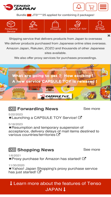 77%Tenso JAPAN provides overseas forwarding service and shipping proxy. EMS shipping fee is off up to 10%. Airmail, surface mail, and SAL are also available. Forward from almost all Japanese online shopping site such as Amazon and Rakuten. Proxy shopping service and Proxy auction service are also available.