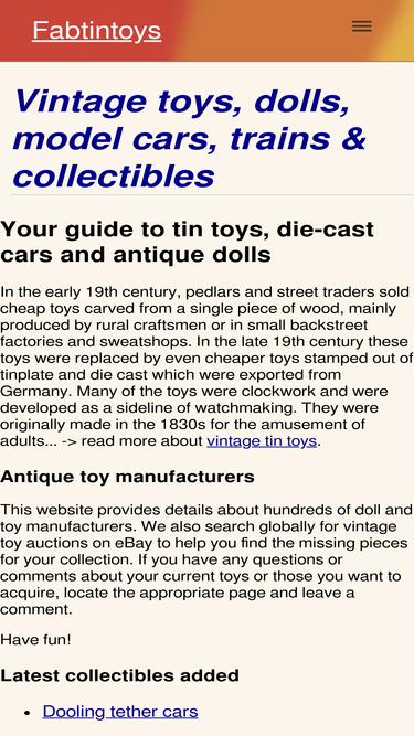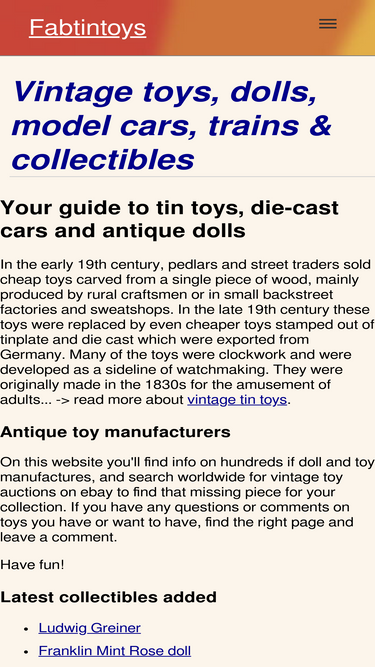 87%looking for collectibles like vintage toys, dolls, model trains or diecast cars? find history, price guides, value and sales of 1300+ manufacturers.