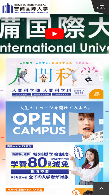 96%吉備国際大学(高梁・南あわじ志知・岡山、各キャンパス)の、学部・学科の案内・オープンキャンパス・土日見学会・入試案内・就職情報など。