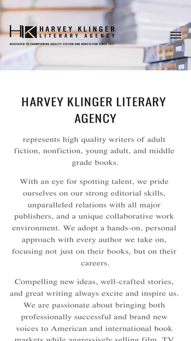 89%Harvey Klinger Literary Agency represents high quality writers of adult fiction, nonfiction, young adult and middle grade books. With an eye for spotting talent, we pride ourselves on our strong editorial skills, unparalleled relations with all major publishers, and a unique collaborative work envi