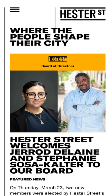 52%Hester Street is an urban planning, design and development nonprofit that works to ensure neighborhoods are shaped by the people who live in them. We offer planning, design and community development technical assistance to community-based organizations, government and other agencies. Our goal is equitable, sustainable and resilient neighborhoods and cities.