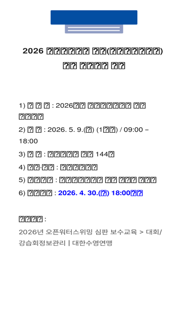 79%연맹 소개, 수영규정 및 규칙정보 수록, 선수 등록, 대회일정, 경기기록 안내.