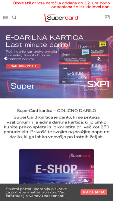 79%SuperCard je ime za darilne kartice, s katerimi podarite najlepše darilo, svobodo izbire! So edine darilne kartice, ki jih lahko v različnih vrednostih kupite preko spleta in koristite pri več kot 250 ponudnikih. Celotno skupino sestavlja 8 različnih kartic: SuperCard Black, SuperCard White, SuperE, SuperCard Gourmet, SuperCard Family, SuperCard Wellness, SuperCard Sport in SuperCard Eco. Privoščite svojim najdražjih popolno darilo, ki ga lahko vnovčijo po lastnih željah. Seznam vseh ponudnikov.