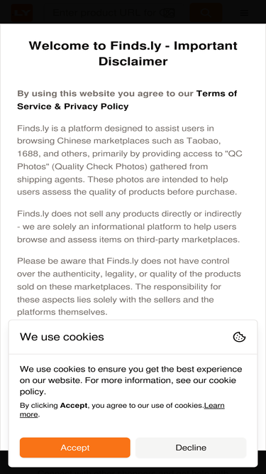 83%Finds.ly provides QC (Quality check/control) photo lookup of products on Chinese marketplaces such as Pandabuy, Superbuy, AllChinaBuy, Taobao, Weidian, 1688, Tmall.