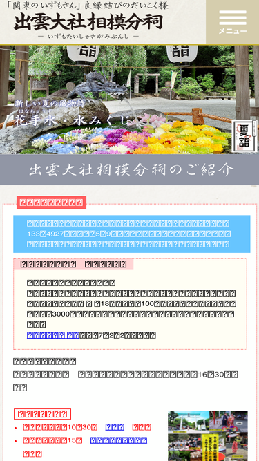 77%関東の出雲さん、出雲大社相模分祠公式ホームページです。縁結びの神様として信仰を集めるパワースポットです。