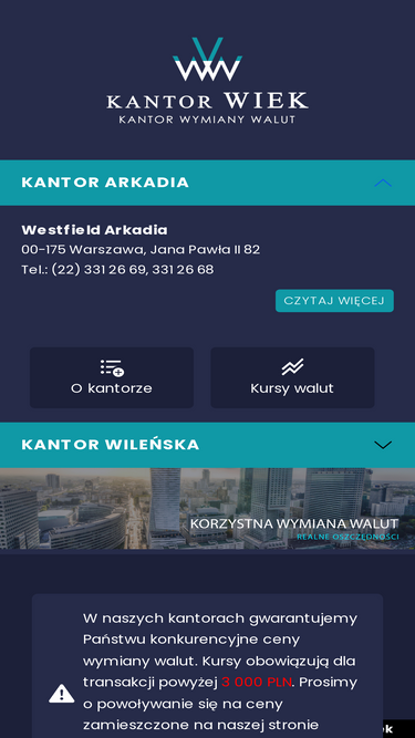 93%Zapraszamy do naszych Kantorów w Warszawie mieszczących się w Centrach Handlowych Wileńska i Arkadia. Najniższe ceny walut w Warszawie. Euro Dolar i inne..