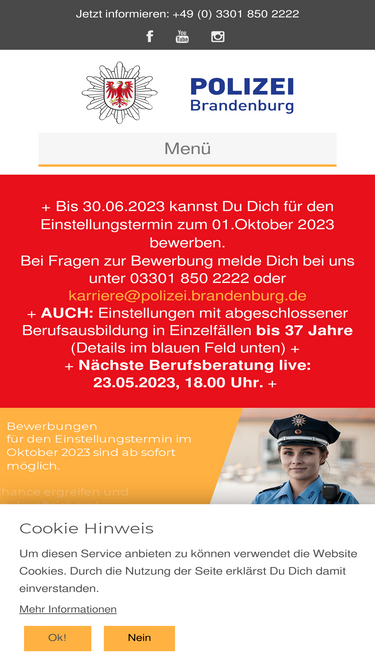 Das ist das Karriereportal der Polizei Brandenburg. Hier erhältst du sämtliche Informationen zur Ausbildung oder Studium bei der Landespolizei. Informiere dich über Einstellungsvoraussetzungen, die Bewerbung oder Kontaktmöglichkeiten.