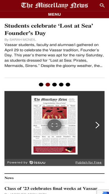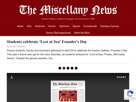 56%The Miscellany News, one of the oldest collegiate weeklies in the country, has served as the student newspaper of Vassar College since 1866. Produced by more than 40 student volunteers, The Miscellany News sets Vassar’s standard for in-depth reporting, creative thinking, exemplary writing and journa