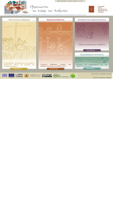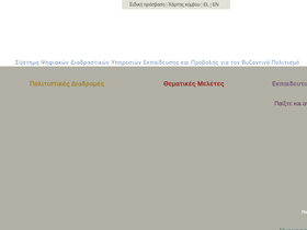 85%οι ηλεκτρονικές ψηφιακές υπηρεσίες: «εξερευνώντας τον κόσμο του βυζαντίου» παρέχουν στοχευμένο ψηφιακό περιεχόμενο για την ανάδειξη της κληρονομιάς του βυζαντινού πολιτισμού μέσω διαδραστικών ψηφιακών υπηρεσιών πληροφόρησης. οι υπηρεσίες αυτές προβάλλουν και πληροφορούν εκπαιδευτικούς, ερευνητές, φοιτητές, μαθητές και απλούς ενδιαφερόμενους πολίτες για μνημεία, προσωπικότητες, ιστορικά γεγονότα, επιτεύγματα, αλλά και όψεις καθημερινής ζωής των βυζαντινών. το περιεχόμενο του ιστότοπου προσφέρεται στα ελληνικά και αγγλικά.