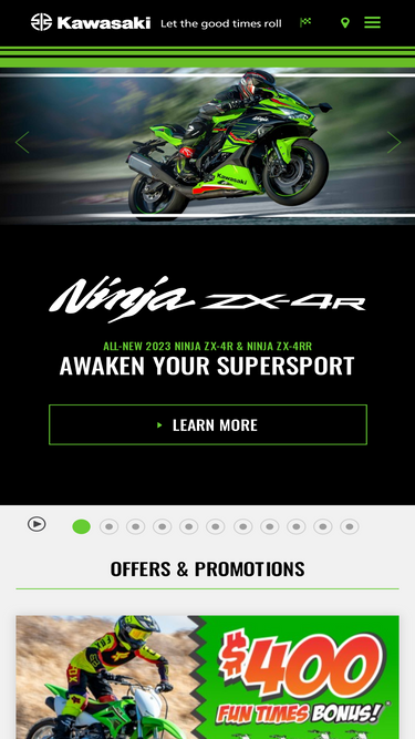 80%Official website of Canadian Kawasaki Motors Inc. distributor of powersports vehicles including: motorcycles, ATVs, Side-x-Sides and personal watercraft.
