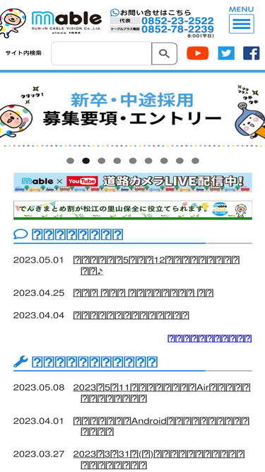 80%島根県松江市にあるマーブル 山陰ケーブルビジョンは、あなたのおウチのテレビをもっと楽しくする、地域密着のケーブルテレビ局です。テレビ放送サービスはもちちろん、インターネット接続サービス、スマートフォンの取扱などを行っております。