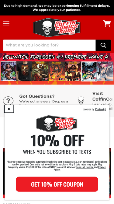 95%Mailing Address Coffin Comics, LLC40 West Brown RoadMesa, AZ 85201 Get in Touch! Visit the Coffin Comics Help Desk - OR - Drop us an email: inquiries@coffincomics.com