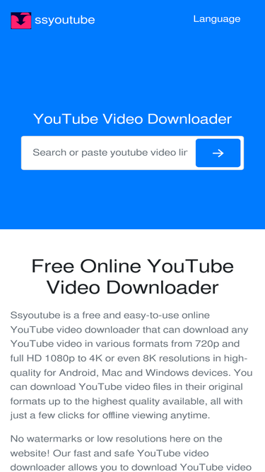 100%ssyoutube is a free, fast, secure and safe online video downloader allowing to download videos from youtube,facebook and so on.you can download 360p,720p,hd,1080p,2k, 4k video & mp3 audio from sites for free by ssyoutube.