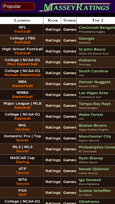 73%computer ratings for virtually every sport: college football, basketball, hockey, soccer, and baseball, nfl, nba, nhl, mls, wnba, and more. links to other rankings, theory, and data. former contributor to college football's bcs