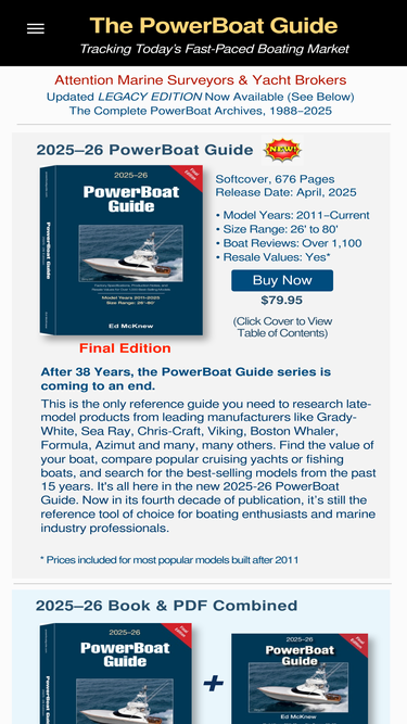 92%Boat reviews and resale values for hundreds of motor yachts, trawlers and fishing boats. All that and more in the PowerBoat Guide.