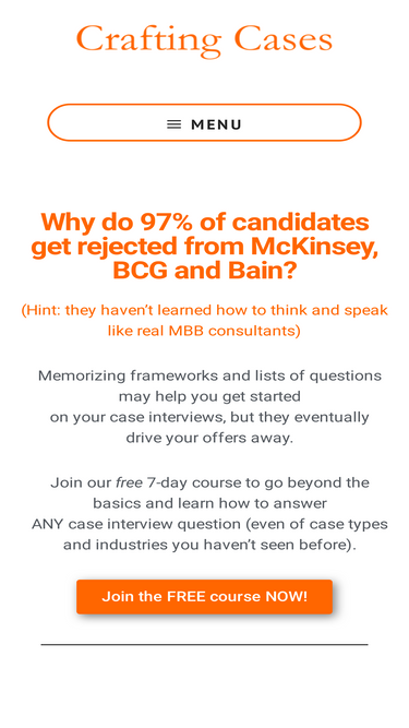 98%We create in-depth case prep materials that will give you an edge on your McKinsey, BCG and Bain case interviews. Join our free 7-day course now!