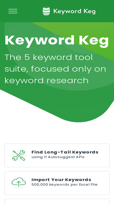 70%Keyword Keg's 5 keyword tools: Find Keywords (get data from 11 APIs), Import Keywords, Related Keywords, People Also Ask For Keywords & Merge Words.