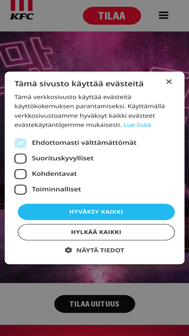 81%Ota yhteyttä Palautteesi on meille tärkeää – auta meitä kehittymään entistä paremmiksi! Your feedback is important to us! Please send us feedback and help us improve. Please enable JavaScript in your browser to complete this form.Please enable JavaScript in your browser to complete this form.Mitä palautteesi koskee? (What would you like to share feedback on?) *Ravintola (Restaurant)Valitse…KFC KamppiKFC TriplaKFC ItisKFC SelloKFC Iso OmenaKFC Ideapark SeinäjokiKFC TurkuMilloin (Day/Time)Palaute (Feedback) * Nimi (Name) * FirstLast Sähköposti (Email) * Yhteydenotto Haluan, että minuun otetaan yhteyttä (I would like to be contacted.) Lähetä