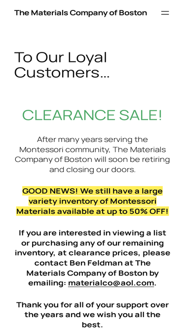 94%CLEARANCE SALE! After many years serving the Montessori community, The Materials Company of Boston will soon be retiring and closing our doors. GOOD NEWS! We still have a large variety inventory of Montessori Materials available at up to 50% OFF! If you are interested in viewing a list or purchasing any of our remaining inventory, […]